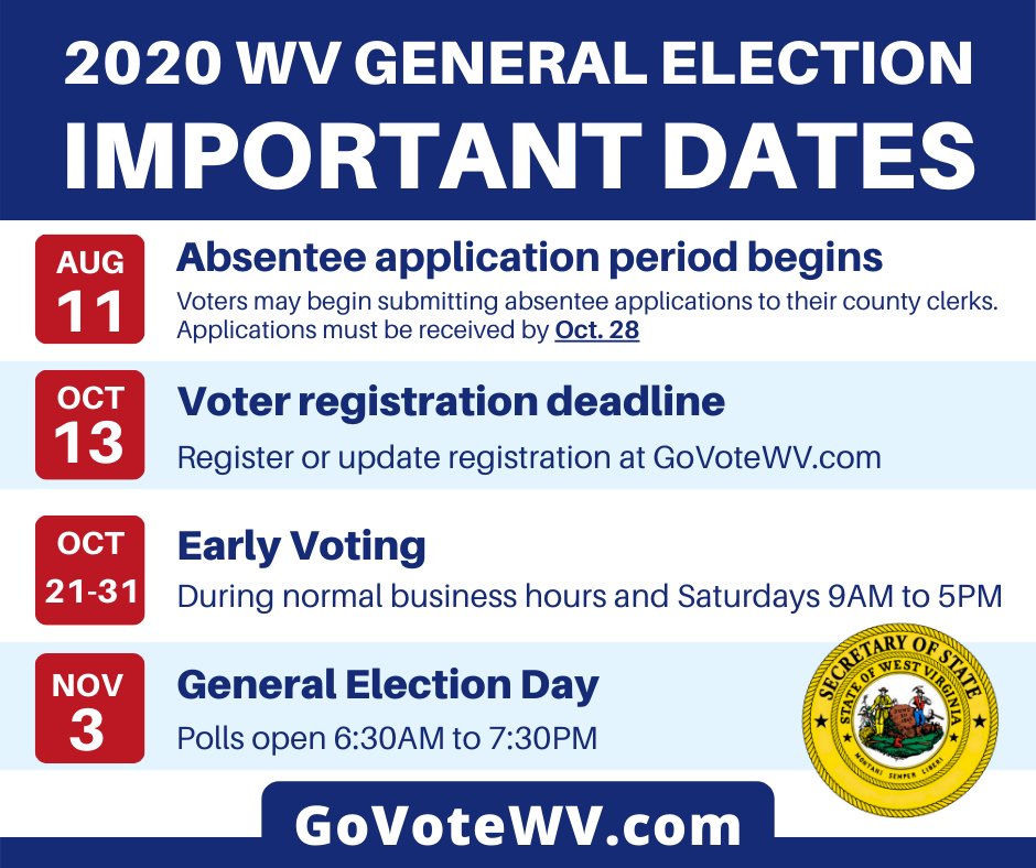Remember: Due to COVID-19, all West Virginia voters have the option to vote absentee. All registered voters should have received an absentee ballot application in the mail. This is the safest way to vote while protecting your health and the health of others.