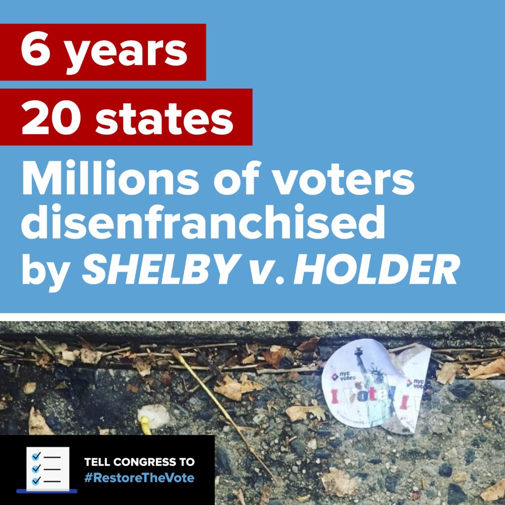 Since the decision, a number of states have implemented laws that disenfranchise voters, and disproportionately affect young people and communities of color — including strict voter ID laws, gerrymandering and voter purges.