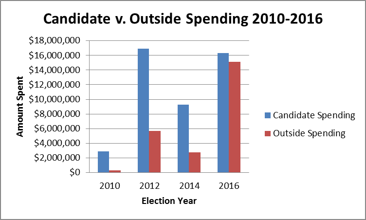 - Prior to the run-up to the November general election, much of the super PAC spending in 2016 went into May’s state Supreme Court race. Super PACs spent more than $3.6 million to influence the outcome of the race — nearly $2 million more than all five candidates’ campaigns combined. (According to the Brennan Center for Justice, spending by outside groups has played a larger role in 2016 state supreme court elections than in past years.)