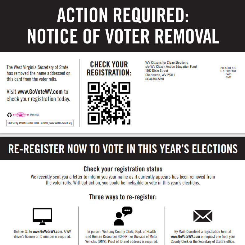 (Charleston, WV) – WV Citizens for Clean Elections (WVCCE), a coalition of organizations dedicated to increasing election transparency and advancing democratic reforms throughout the state, has launched a program to inform 20,000 West Virginians across the state that their names as they currently appear have been removed from the voter rolls through a new direct mail campaign.